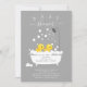 Adorable duck in a bath tub with shower head set on a dark grey background for a twinsl baby shower. Flip our sweet invitation over to view a coordinating duck back for an extra special touch. Visit our shop to view matching shower items. This invitation is also available for twins & triplets!