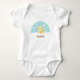 A cute baby creeper that comes with a yellow rubber duckie which is a good old favourite bath toy for toddlers taking a shower. Fun bubbles floating in the background. Personalise easily with child's name. Blue background makes this a perfect gift for newborn baby boys and toddlers on their baby shower or first birthday.