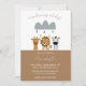 This cute custom baby shower invitation features a boho baby animal theme. The phrase "we're having a baby" is printed across the top in an elegant script font. Three cute safari animal babies - a giraffe, a lion cub, and a zebra - are standing together beneath a rain cloud. The earthy, boho colours are gender neutral so it's suitable for a baby boy or baby girl shower.
