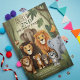 Featuring a group of safari jungle zoo animals, including lions, elephants, tiger, zebra, and monkey, in a forest.