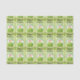 Tissue paper with an adorable repeating pattern. A cartoon illustration of a little monkey peeking out from behind a green bush inside an olive green square. Surrounded by a wreath of tropical leaves. A banner of tropical leaves also stretches across the top of each square. Happy Birthday written in a trendy font. Set on an olive green watercolor background.