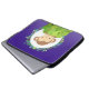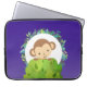 Laptop sleeve with a cartoon illustration of a little monkey peeking out from behind a green bush. Surrounded by a wreath of tropical leaves. Set on a purple background.