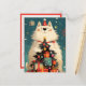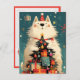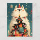 Cute Samoyed dog smiling beside Christmas trees decorated with colorful ornaments and presents. Creating a warm and joyful holiday mood perfect for Christmas illustration themes.