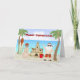 Cute Santa Beach Holiday Greeting Card with decorated palm trees, a sand snowman, sandcastle and holiday ornaments.