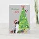 On the front of this Christmas card, a black and white Border Collie dog wears a Santa hat while he sits beside a Holiday tree. Brightly wrapped gift packages are scattered about, and a bullfinch is landing on the Christmas tree. The red and green text says "Christmas JOY". Inside is stylised text that says MERRY CHRISTMAS, and a text field for you to customise.