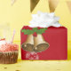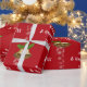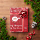 Modern, elegant, and cute Christmas wrapping paper, with a cartoon of Santa Clause in his red hat and costume, the text "Merry Christmas & Happy New Year 20XX" in stylish script / calligraphy handwriting, and a personalised name. With sprinkles of white and silver snowflakes, and two pairs of golden Xmas bells with a sprig of holly, on a Xmas red background.