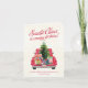 A festive no-photo holiday card featuring the words "Santa Claus is coming to town" in a fun typeface with a watercolor rustic truck filled with gifts, Christmas tree and Santa hat. © 2020-Present | The Spotted Olive | All Rights Reserved.