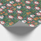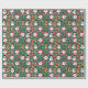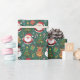 Premium wrapping paper with a whimsical repeating pattern of jolly Santas, snowmen, gingerbread men, Christmas trees, gifts, and candy canes on a festive green background—perfect for joyful holiday gift wrapping.