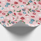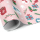 Christmas wrapping paper for kids with a pattern of snowmen, Santas, steaming cups of cocoa, snowflakes, stars, hearts, pine needles, berry twigs, gifts and more in a cute style against light pink.