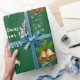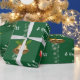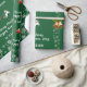 Modern, elegant, and cute Christmas wrapping paper, with an image of a unicorn pulling Santa's sleigh (full of gifts), the text "Merry Christmas & Happy New Year 20XX" in stylish script / calligraphy handwriting, and a personalised name. With sprinkles of white and silver snowflakes, and a pair of Xmas bells with a sprig of holly, on a Xmas green background.