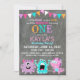 Cute and scary little monsters on chalkboard background with colourful grunge stripe back design birthday invitation card.