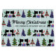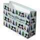 Adorable Scottish terriers giving gifts sandwiched between buffalo plaid Christmas trees. Cute gift bag for dog lovers personalised with your message.