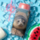 An adorable can cooler featuring a cute seal sitting on a boat dock by the ocean just look sweet as can be.