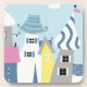 Cute pastel coloured digital art of tall buildings against pastel blue summer sky.