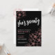 Cute Seventy Black Rose Gold 70th Birthday Party Invitation. A fun but elegant 70th birthday party invitation with girly pink or rose gold, black and white flowers for the young at heart. Please note there is no gold shimmer, it is just a colour similar to it. A playful flower pattern frames a script typography "she's seventy" mixed with a more classic serif font. Celebrate seventy years of life with this beautiful botanical design. The fun part is you can change out ALL of the colours!! You can not only change the background colours and font, but you can change the lines for the flowers as well.