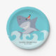 Fun shark theme paper plate for a boy's birthday party. Illustration of a shark flipping out of the water with a red and white striped party hat. Customise this product by adding your child's name, age, and event date at the bottom. Great for pool, waterpark, and beach parties in the summer!