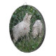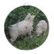 This awesome dartboard features a photograph of a pair of cute fluffy sheep. The sheep are surrounded by wild flowers and long grass and are standing underneath a tree and reaching up, greedily eating some leaves. They have thick white coats of wool and very cute faces.