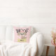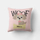 This adorable pillow shows a cute shih tzu puppy dog with a pink hair ribbon, and sitting near a gold coloured boned that you can personalise with your dog's name. "Woof" appears in big fun black letters behind the dog. The background is filled with soft pink and white polka dots. Graphics by Sanqunetti Design at Mygrafico.