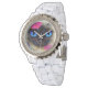 A cute Siamese cat on an elegant white wrist watch is a great gift to have. This feline is adorned with pink ribbon on her neck and a flower on her head is a great cat image to be on a watch. It will look nice on a wrist with this watch and a design that glitters around it. I created this Siamese cat a while ago and I am glas to know that this will be on this watch. If you want something different that you can not find, just let me know by sending an email at jraym48@gmail.com and I will be happy to create a new design that you like. Copyright ©Jude Maceren artist.