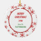 On the front of this Holiday ornament is a cute grey Siberian Husky puppy wearing a cap and bow tie. Beside him is a blue striped Christmas gift. The images are placed on a white oval framed by a retro red snowflake pattern. The back of the ornament has the same background and oval with your custom text in two fields. Cute! *Thanks to Gift Season Shop for the dog image in this design.