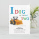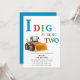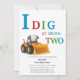 I dig at being one 1st birthday invitation in vibrant coloured text in blue red and green featuring a digger all on a white background ideal for a digger themed boys birthday. a simple simplistic but modern design, also available for instant downloads.
