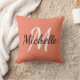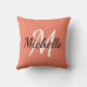 Throw pillow with a salmon orange background and white custom monogram first initial and first name.