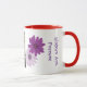 Cute coffee mug for two sisters with an horizontal photo, two illustrations of purple flowers, one darker and one lighter, and the text "Sisters Are Forever." You can personalise both the photo and the text.