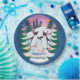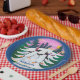 A fun Paper Plate to Personalise, with two cute Penguins having fun, ice-skating, in a snowy landscape with fir trees and a setting sun; from a hand-painted paper collage by Judy Adamson. The background and text colour shown here can be changed if there's another dark colour you prefer.