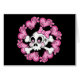 Cute skull and crossbones with polka dotted bow surrounded by pink hearts and flowers.