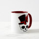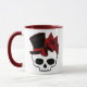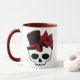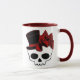 This cute skull is wearing a fancy little top hat with red bows and flowers.