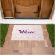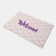 A welcome doormat a cute pattern of sleeping kitty cats. On a pink background.