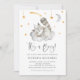 Twinkle twinkle little star! Invite family and friends with this customisable baby shower invitation. It features a cute watercolour sleeping baby racoon with a grey cloud and moon and gold stars. Personalise by adding your own event details. This racoon baby shower invitation is perfect for It's a Boy baby showers.