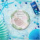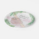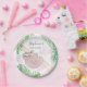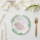 This fun baby shower paper plate features a sweet smiling baby sloth hanging from a branch, with green watercolor jungle leaves and pink clouds.