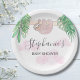 This pretty baby shower paper plate features a sweet baby sloth hanging from a branch, with green watercolor jungle leaves and pink clouds.