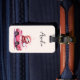 A luggage tag with an adorable illustration. A happy looking sloth sitting in a sporty pink convertible. Waving as he drives by. With hearts floating upwards.