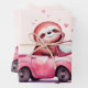 Wrapping paper sheets with an adorable illustration. A happy looking sloth sitting in a sporty pink convertible. Waving as he drives by. With hearts floating upwards.