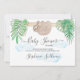 This cute baby shower invitation features a sweet baby sloth hanging from a branch, framed with green watercolor jungle leaves and turquoise clouds.