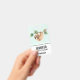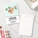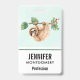 Name badge with an adorable sloth hanging upside down from a tree branch. Tree branch is decorated with tropical leaves and berries.