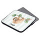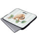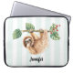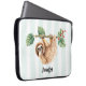 Laptop sleeve with an adorable sloth hanging upside down from a tree branch. Tree branch is decorated with tropical leaves and berries.