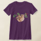A t-shirt with an adorable sloth hanging upside down from a tree branch. Tree branch is decorated with tropical leaves and berries.