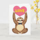 Designed with a cute sloth sitting in the center, this card keeps the focus on a simple message of love. The sloth is warm brown with a light beige belly and darker patches on its arms and legs. It sits cross-legged and lifts both arms to hold up a large pink heart above its head 💘. Inside the heart, the word “LOVE” appears in sunny yellow letters that look thick and easy to read, placed right in the middle. The sloth looks happy, with a wide open smile, rosy cheeks, and dark eyes framed by its usual face markings 😘. A dark blue bow tie at its neck adds a sweet, dressed-up touch. The background is plain white, so the sloth and heart stand out clearly and feel calm and friendly.