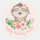 Trendy Happy Birthday round sticker with cute sloth for little and big girls accented with peach and pink colours on a blush pink background. Personalise with name and age (optional)