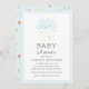Fun, modern baby shower invitation feauturing cute smiling cloud and colourful raindrops.