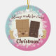 Kawaii style smores Christmas holiday ornament for cute desserts lovers! Smiling happy marshmallows, graham cookie and chocolate bar on a custom color background with decorative faux bokeh sparkle.