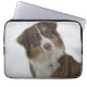 Cute doggy looking right at the camera! Dog has a little bit of snow on his head. The camera has his full attention.
