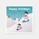Winterly graphic illustration featuring two cute snowmen snowboarding in a snowy environment.