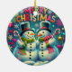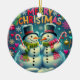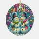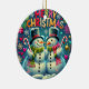 Cute snowman couple with a hats, scarves and mittens, surrounded with colourful Christmas hearts and swirls and silver, gold and white smoke, glittery colourful splatter, colourful snowflakes, candy canes and hearts.
