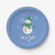 This paper plate features a cute cartoon snowman image. The snowman is wrapped up in a green scarf, and wears a matching bright green hat. There are various sized snowflakes falling round about him. White text at the bottom says Let it Snow! The image and text are placed on a blue background. Festive and fun for the Holiday season or throughout the winter.