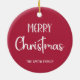 Adorable Christmas ornament with an illustration of a snowman roasting marshmallows by the fire. Personalise the back with your own family name. Illustrated and designed by Patricia Alvarez.