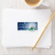 Snowy scene features snowman dressed in green sweater/gloves and a white and blue hat.